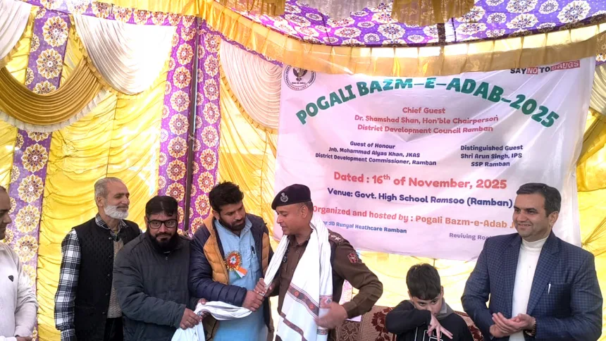 بانہال// معروف ادبی اور ثقافتی انجمن پُوگلی بزمِ ادب، کی جانب سے ہائی سکول رامسو میں ایک روزہ شاندار ثقافتی پروگرام کا انعقاد کیا گیا جس میں ڈپٹی کمشنر رام بن محمد الیاس خان اور ایس ایس پی رام بن ارون گپتا نے بطور مہمانِ خصوصی شرکت کی جبکہ بھاری تعداد میں زندگی کے مختلف شعبوں سے وابستہ لوگوں اور علم و ادب اور شاعری سے دلچسپی رکھنے والے افراد نے شرکت کی ۔ چیئرمین پوگلی بزم ادب عبدالطیف بلُبل اور بزم کے صدر گل زبیر ڈینگ اور انجمن کے دیگر عہدیداروں اور ممبران نے مہمانوں کا پرتپاک استقبال کیا ۔ضلع رام بن سمیت یوٹی کے دیگر علاقوں میں پوگلی ادب ، ثقافت اور زبان کی ترقی اور فروغ کیلئے کام کرنے والی انجمن پوگلی بزم ادب کی اس تقریب میں روایتی رقص، موسیقی اور شاعری سمیت مختلف ثقافتی اور رنگارنگ پروگرام پیش کئے گئے جنہوں نے مقامی ورثے کی خوبصورت جھلک پیش کی۔ ضلع کے مختلف سکولوں کے طلبہ و طالبات اور دیگر اُبھرتے فنکاروں نے شاندار طریقے سے اپنے فن کا مظاہرہ کر کے حاضرین کو محظوظ کیا۔ اس پروگرام میں بچوں کی طرف سے نشہ مکت مہم کے تحت کئی پروگرام پیش کئے اور سماج اور نوجوانوں کو نشہ کے مہلک مرض سے دور رہنے اور اس کے جان لیوا اثرات کو بخوبی پیش کیا۔اس موقع پر پُوگلی بزمِ ادب کے صدر گُل زبیر ڈینگ نے ضلع و سب ضلع انتظامیہ، سول سوسائٹی، منتظمین اور تمام شرکاء کا تہہ دل سے شکریہ ادا کیا اور پروگرام کو کامیاب بنانے پر ان کی کاوشوں کو سراہا ہے۔ ڈپٹی کمشنر محمد الیاس خان نے پوگلی بزم ادب کی ثقافتی سرگرمیوں کے فروغ کے لیے کوششوں کی تعریف کی اور مقامی ثقافت و روایات کے تحفظ پر زور دیا۔ انہوں نے مستقبل میں بھی ایسے پروگراموں کے لیے ہر ممکن تعاون کا یقین دلایا۔ ایس ایس پی ارون گپتا نے اپنے خطاب میں کہا کہ ثقافتی سرگرمیاں سماجی ہم آہنگی اور بھائی چارے کو مضبوط بنانے میں اہم کردار ادا کرتی ہیں اور ہمیں انہیں اسی جوش و جذبے کے ساتھ جاری رکھنا چاہئے ۔ تقریب کا اختتام شکریہ کی پیشکش پر ہوا، جس کے بعد معزز مہمانوں کو یادگاری تحائف پیش کیے گئے۔پوگل زبان کی ترقی اور ترویج میں اپنا کردار ادا کرنے والے ادیبوں ، فنکاروں ، رضاکاروں، سماجی کارکنوں ، صحافیوں اور زندگی کے دیگر شعبوں میں نمایاں کارکردگی دکھانے والے افراد کو معزز مہمانوں کے ہاتھوں بزم کی طرف سے انعامات ، اسناد اور اعزازات سے نوازا گیا اور ان کے کام کو سراہا گیا ۔