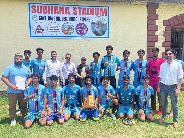 سوپور// گورنمنٹ بوائز ہائر سیکنڈری سکول سوپور، ضلع سطح کی انٹر سکول فٹ بال چمپئن شپ کا چمپئن بن کر ابھرا۔ غیر معمولی مہارت، ٹیم ورک اور عزم کا مظاہرہ کرتے ہوئے، ٹیم پورے ٹورنامنٹ میں مسلسل پانچ فتوحات حاصل کرتے ہوئے ناقابل شکست رہی۔سنسنی خیز فائنل میچ میںہائر سیکنڈری سکول سوپور کا مقابلہ ہائر سکنڈری سکول واگورا سے ہوا اور سوپور قصبے کے سبحان سٹیڈیم میں شاندار کارکردگی کا مظاہرہ کرتے ہوئے 2-0 گول کے فرق سے ٹائٹل اپنے نام کیا۔ پرنسپل گورنمنٹ بی ایچ ایس ایس سوپورنے ٹیم کو مبارکباد پیش کی۔اس ٹورنامنٹ میں ضلع بارہمولہ کے مختلف ہائیر سیکنڈری اور ہائی سکولوں کی کل 32 ٹیموں نے حصہ لیا ہے۔