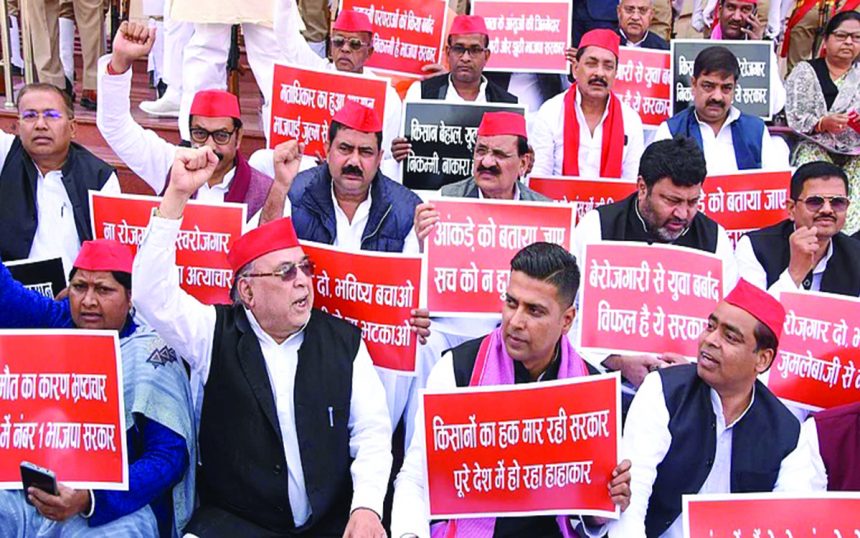 لکھنو// اتر پردیش اسمبلی کا بجٹ اجلاس منگل کو شروع ہو گیا، جہاں پہلے ہی دن سماج وادی پارٹی (ایس پی)کے اراکین نے زبردست احتجاج کیا۔ جیسے ہی گورنر آنندی بین پٹیل نے اپنا خطاب شروع کیا، ایس پی اراکین نے نعرے بازی شروع کر دی، جس کے سبب ایوان میں شور و غل دیکھنے کو ملا۔ احتجاج کے پیش نظر اسمبلی کی کارروائی دوپہر 12:30بجے تک کے لیے ملتوی کر دی گئی۔بجٹ سیشن کے آغاز سے قبل ہی سماج وادی پارٹی کے ارکان نے احتجاج کی منصوبہ بندی کر لی تھی۔ وہ اسمبلی کے باہر سے ہی نعرے لگاتے ہوئے آئے اور سابق وزیراعظم چودھری چرن سنگھ کے مجسمے کے قریب جمع ہو کر مظاہرہ کیا۔ ایس پی کے ایم ایل اے اتل پردھان زنجیروں میں جکڑے ہوئے اسمبلی پہنچے، جبکہ دیگر کارکنان ہاتھوں میں تختیاں اور گھڑے لیے نظر آئے۔ گھڑوں پر یہ اخلاقیات کا استھی کلش ہے تحریر تھا، جبکہ تختیوں پر مختلف نعرے درج تھے، جن میں بھارتیہ جنتا پارٹی پر ریاست میں بھائی چارہ ختم کرنے کا الزام لگایا گیا تھا۔اسی دوران سماج وادی پارٹی کے ایم ایل سی آشوتوش سنہا سائیکل پر اسمبلی پہنچے۔