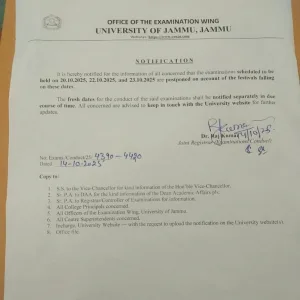 جموں/جموں یونیورسٹی نے آنے والے تہواروں کے پیشِ نظر 20، 22 اور 23 اکتوبر 2025 کو ہونے والے تمام امتحانات ملتوی کر دئیے ہیں۔یونیورسٹی کی جانب سے جاری ایک نوٹیفکیشن میں، ڈاکٹر راج کمار، جوائنٹ رجسٹرار (امتحانات) نے بتایا کہ ملتوی کیے گئے امتحانات کی نئی تاریخوں کا اعلان بعد میں کیا جائے گا۔